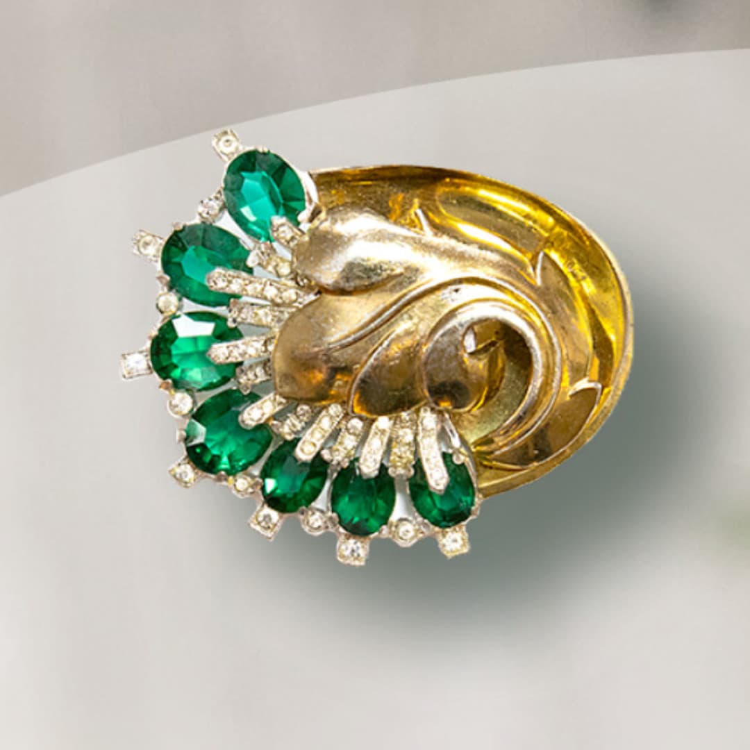 Art Moderne leaf broochGreen and clear rhinestones spill out of this gold-plated leaf brooch design made between 1938-1943